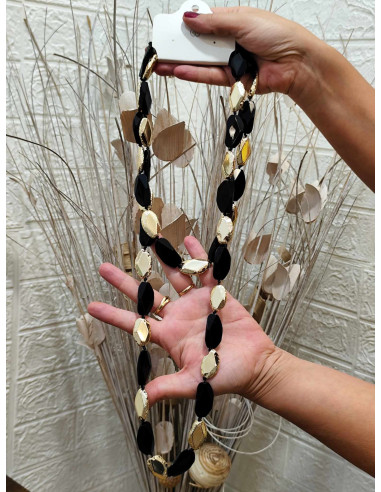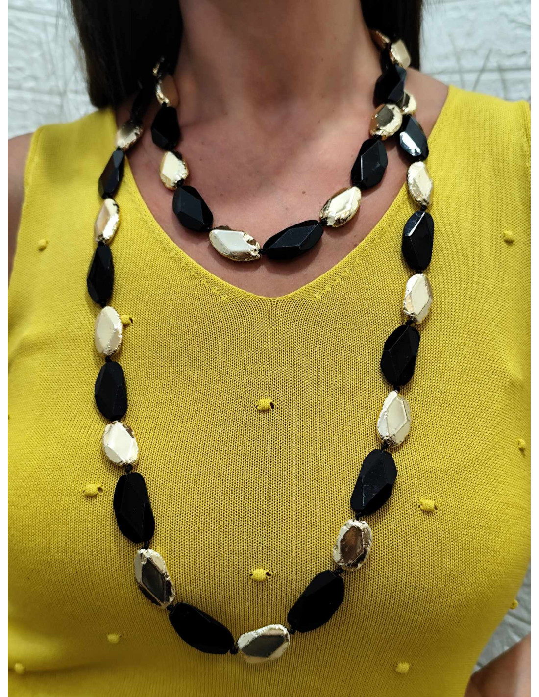 Collar largo con cuentas combinadas doradas y de resina. Puedes darle una vuelta para hacer efecto de doble collar y anudarlo para darle una forma diferente.