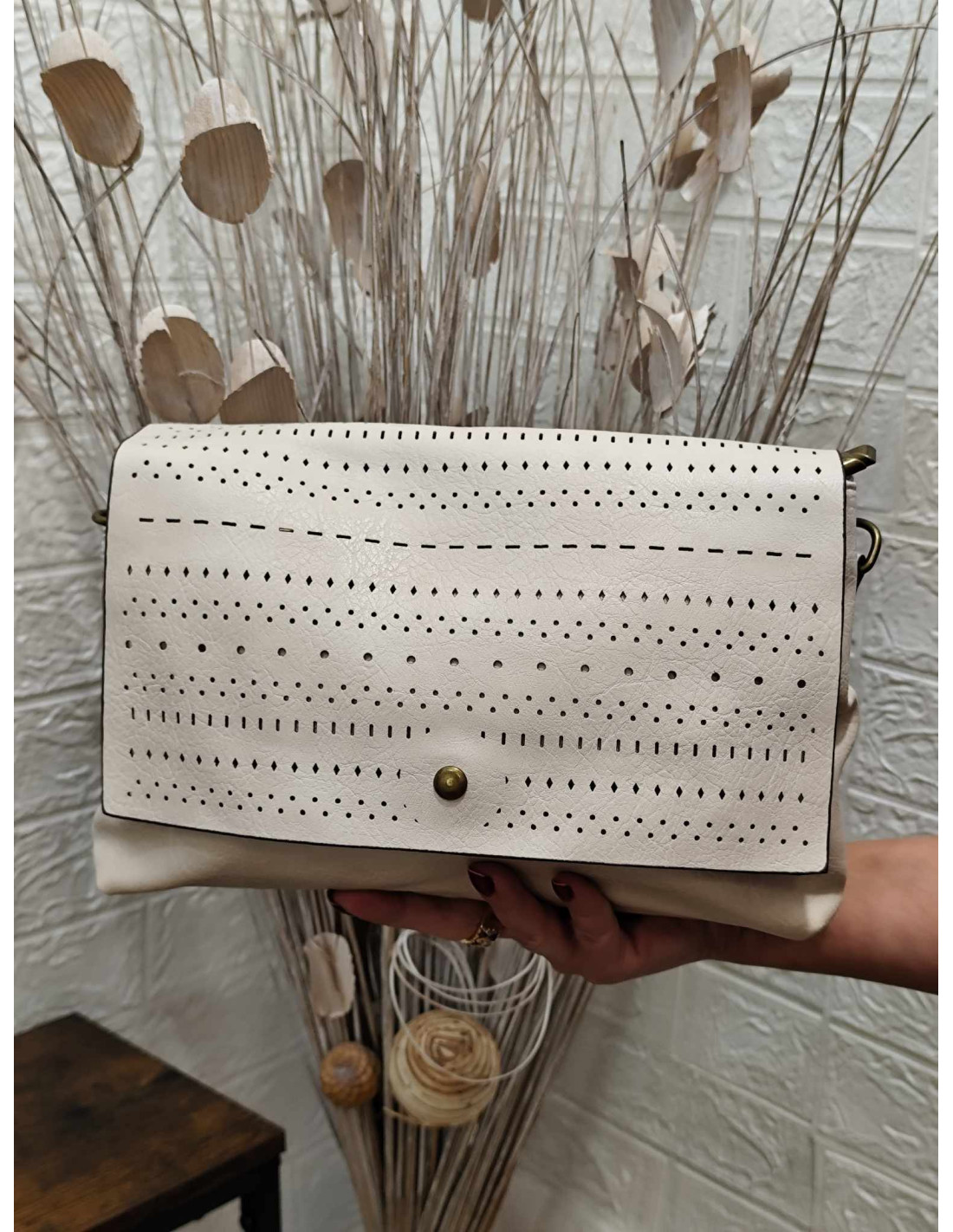 Bolso tipo bandolera, compacto y muy práctico para el día a día. Cuenta con correa ajustable para mayor comodidad y dos compartimentos individuales con cierre de cremallera, ideales para llevar tus objetos organizados y siempre a mano. La solapa troquelada, con cierre de imán, añade un toque elegante y original al diseño.