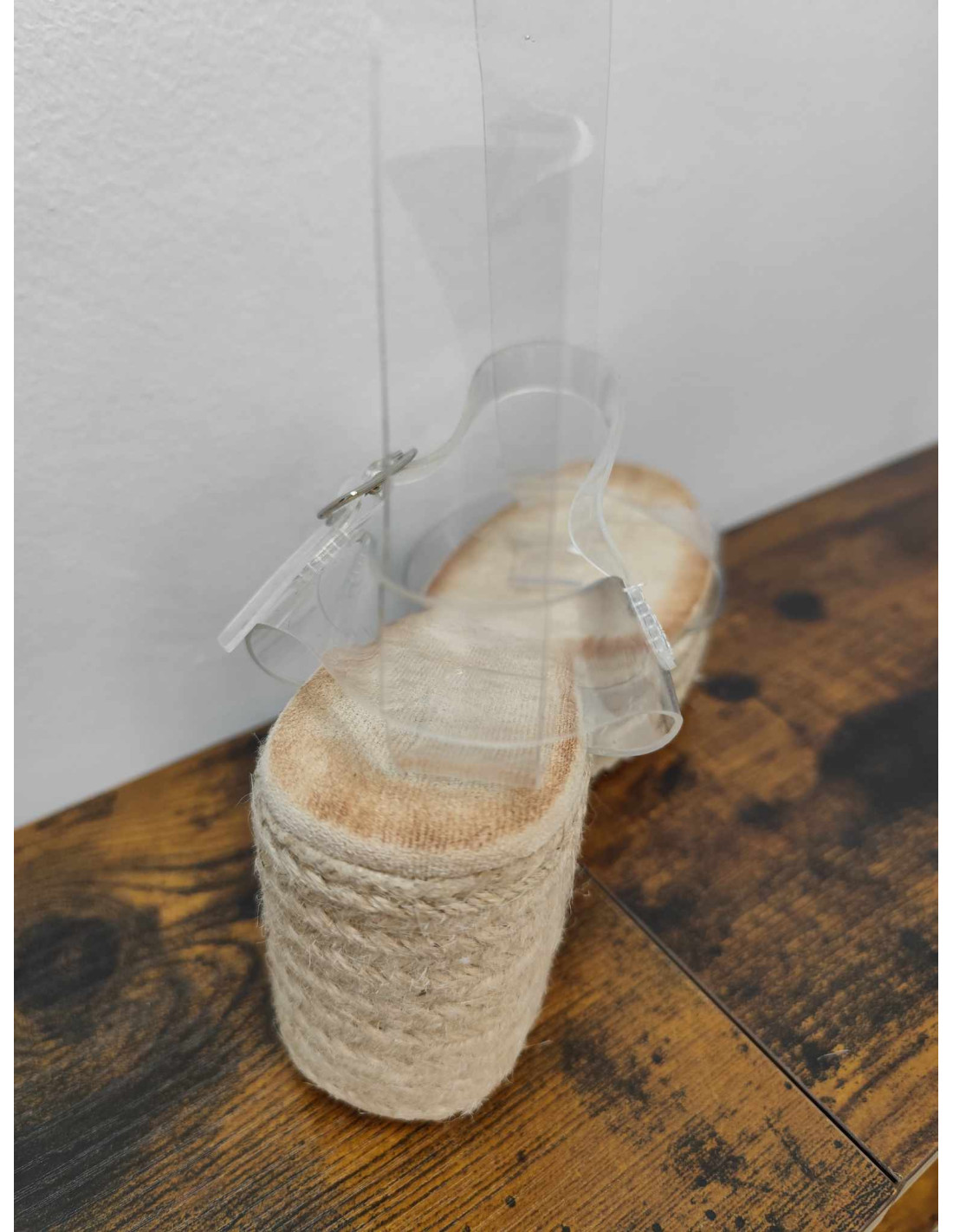 Eleva tu look con nuestras sandalias de tacón ancho de 9 cm y plataforma de 4 cm, ambas forradas de esparto. La parte superior de vinilo transparente, con tira ancha en el empeine y ajustable al tobillo, te ofrece un diseño moderno y sofisticado. Disponibles del 36 al 41, calzan bien. ¡Marca tendencia con comodidad!