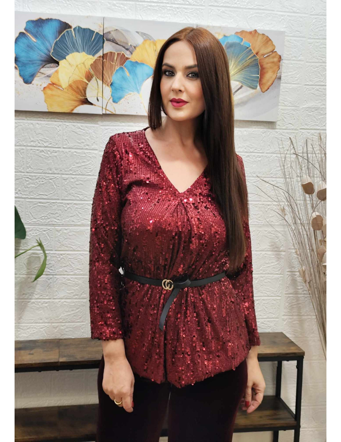 Blusa de lentejuelas ideal para brillar en cualquier ocasión especial. Presenta un favorecedor escote en V y detalle de macho delantero que aporta un toque elegante al diseño. El bajo recogido estiliza la silueta y la manga larga la hace perfecta para eventos de noche o celebraciones.