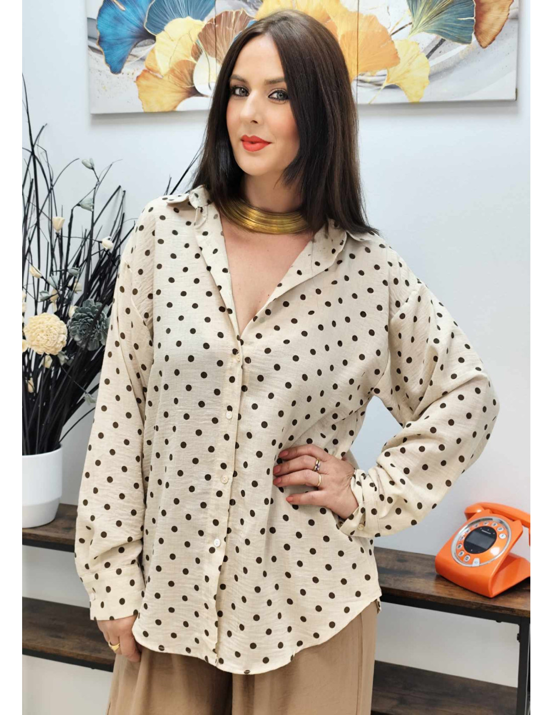 Esta camisa es la definición de versatilidad. Su diseño clásico, abotonado de arriba abajo, ofrece una silueta impecable que se adapta a cualquier ocasión. El estampado de lunares, disponible en 3 colores diferentes, añade un toque de alegría y sofisticación que nunca pasa de moda. Su corte generoso está pensado para que te sientas cómoda y libre, sin renunciar a la elegancia.