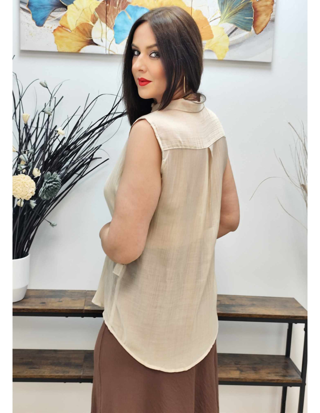 Las mangas sisa aportan frescura y libertad de movimiento, haciendo de esta camisa la opción perfecta para los días más cálidos o para combinar bajo una chaqueta o blazer. Su corte y la naturaleza del tejido permiten una gran adaptabilidad, lo que la convierte en una prenda inclusiva y favorecedora para diversas siluetas.