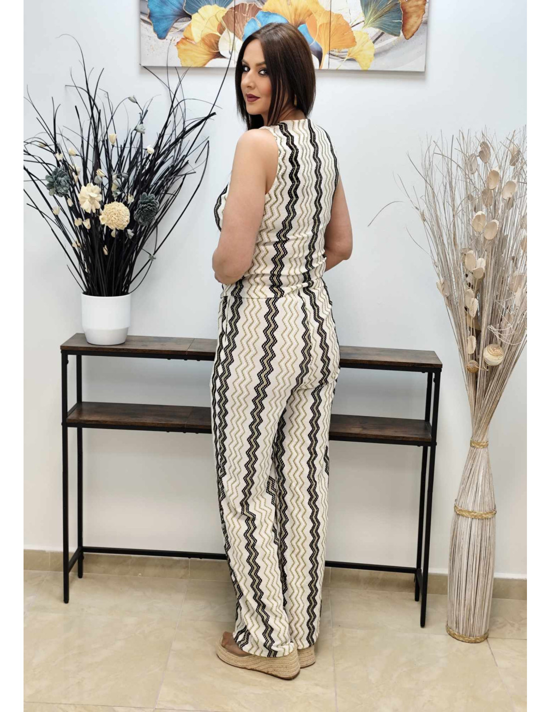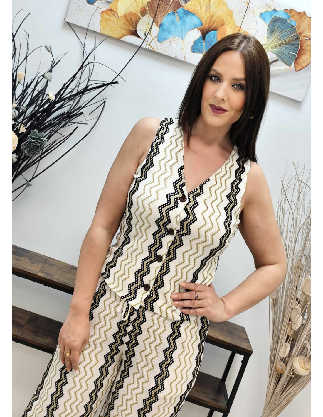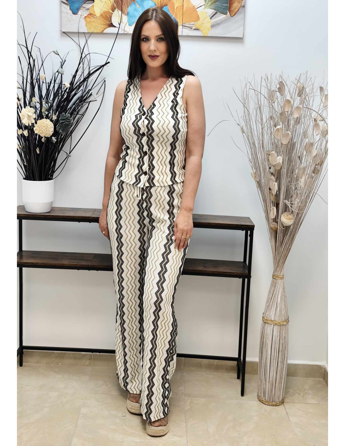 Este conjunto de punto elástico incluye un pantalón ancho con cinturilla elástica, cordón ajustable y bolsillos, y un chaleco con escote en V y cierre de botones.