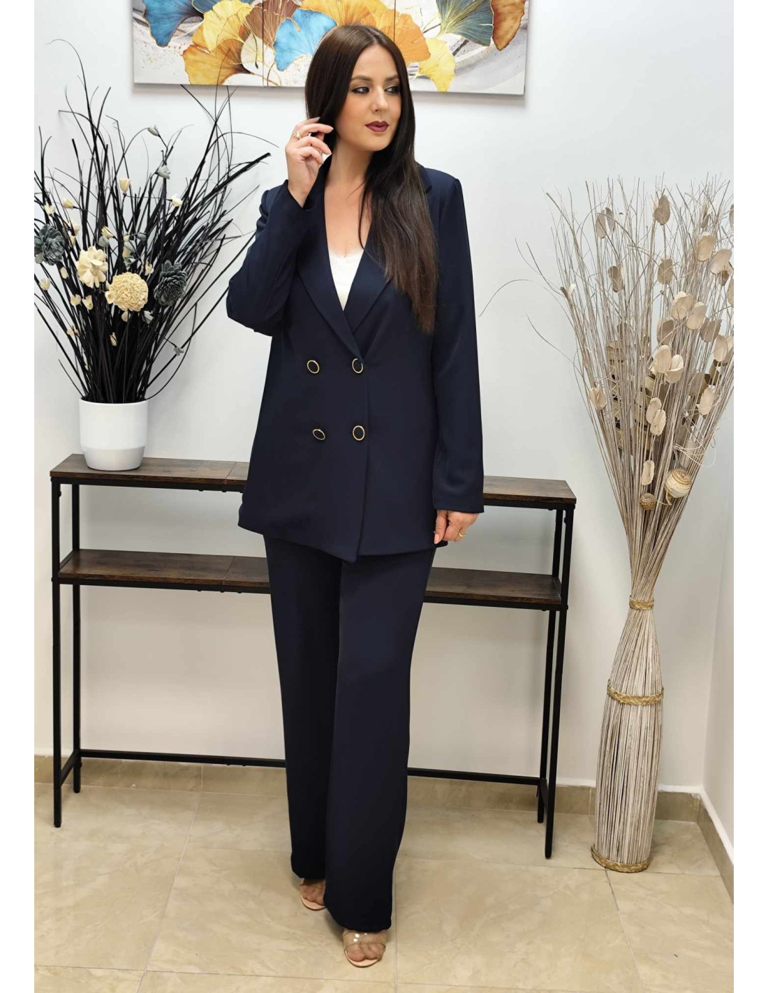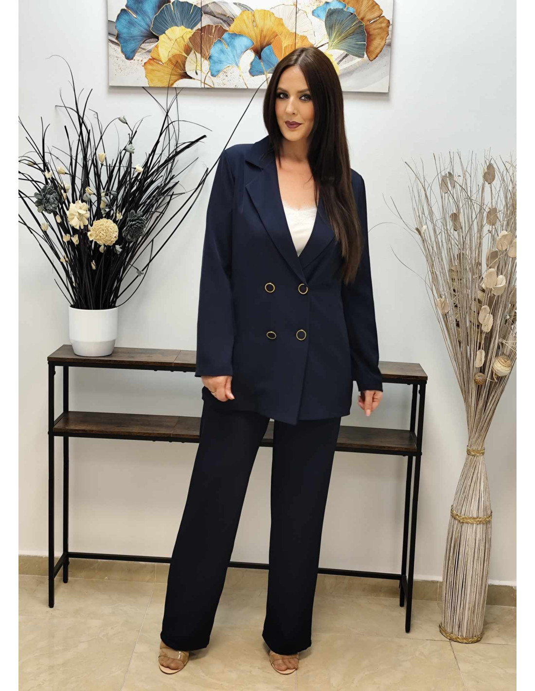 Descubre este traje compuesto por un pantalón de corte recto con goma trasera en la cintura y bolsillos, y una chaqueta oversize cruzada que cierra con botones del mismo color con ribete dorado. Disponible en 3 colores. Es talla única, recomendado para tallas 36 a 40.