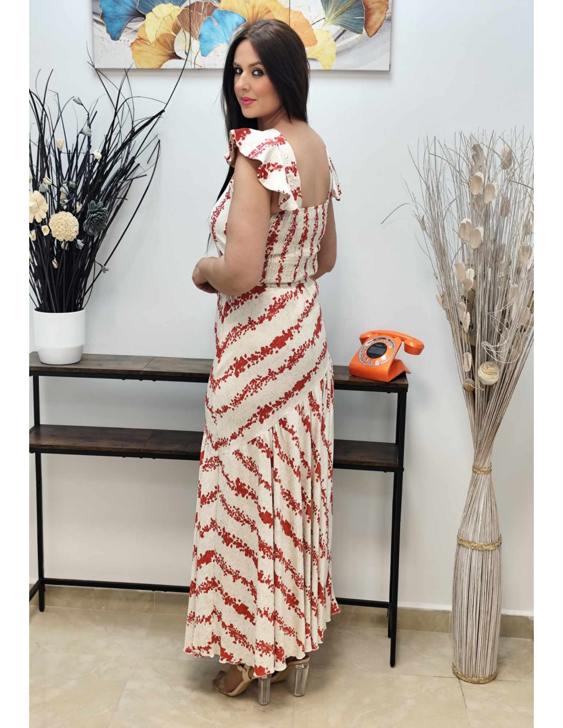 Descubre este conjunto ideal para el buen tiempo. Incluye una falda larga con cinturilla elástica y un top corto de tirantes ajustables con volantito y espalda en nido de abeja. Disponible en 4 colores.