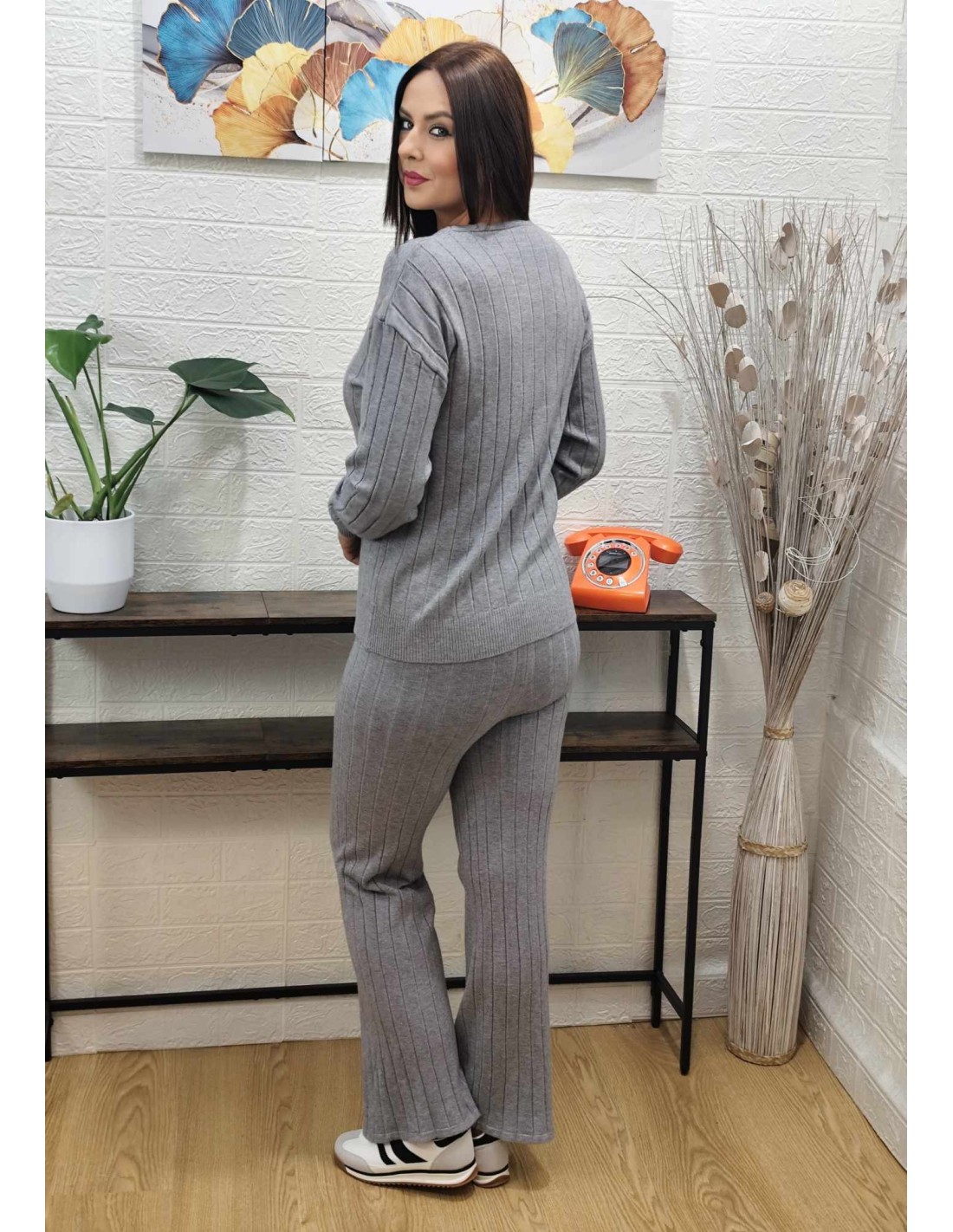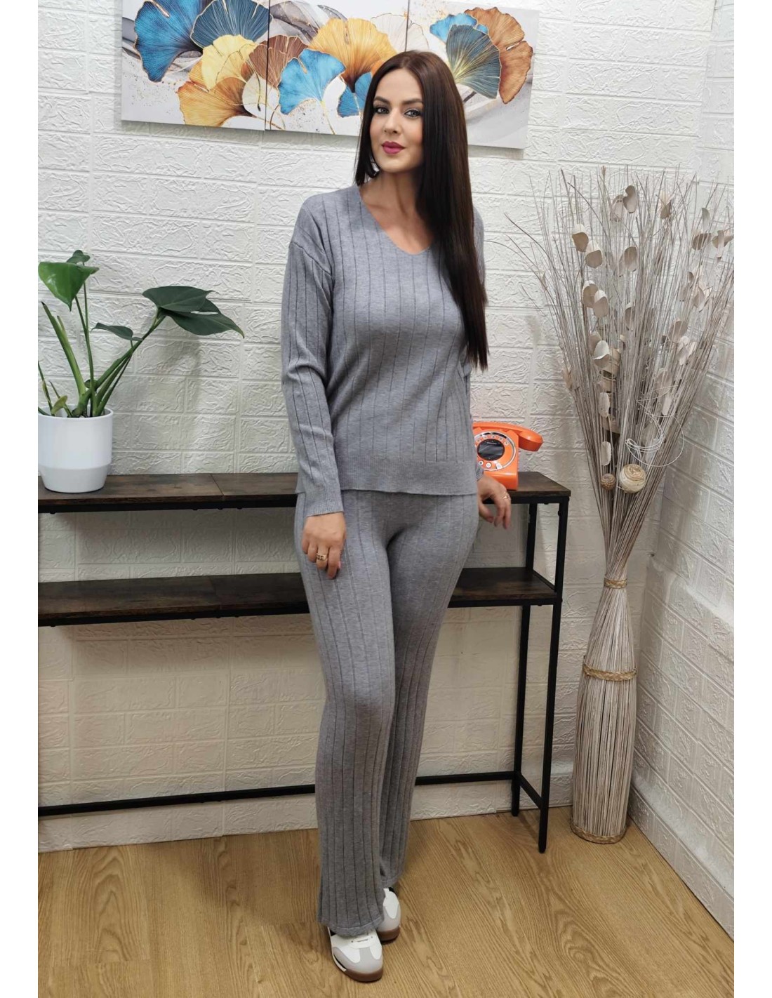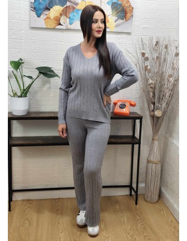 Conjunto de punto formado por pantalón recto de tiro alto y jersey con escote en pico. Es elástico y el tacto es suave y no pica.
