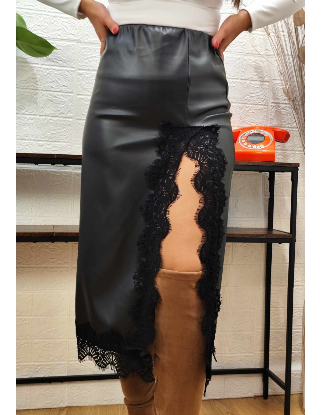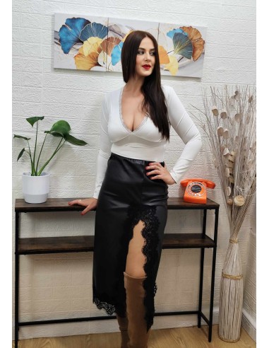 Falda recta de polipiel midi con raja y delicado encaje, cinturilla elástica.