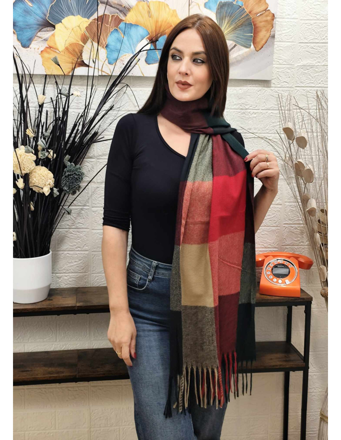 Bufanda confeccionada en suave cashmere, con un elegante estampado de cuadros en colores combinados que aporta un toque de estilo y personalidad a cualquier look. El acabado en flecos en los extremos añade un detalle clásico y sofisticado.