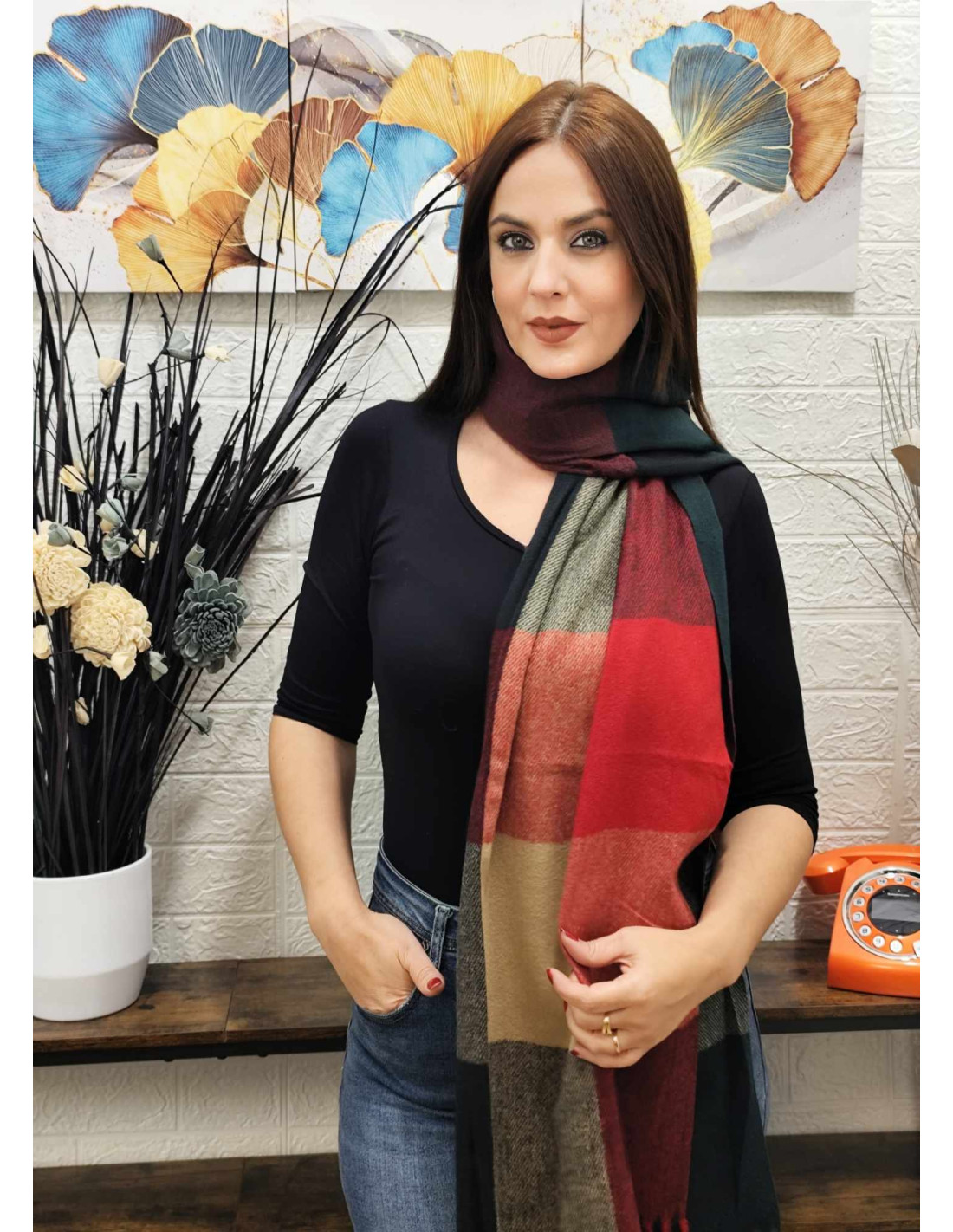 Sus generosas medidas (190 cm de largo y 70 cm de ancho) permiten llevarla de múltiples formas: envuelta al cuello, sobre los hombros o como chal.