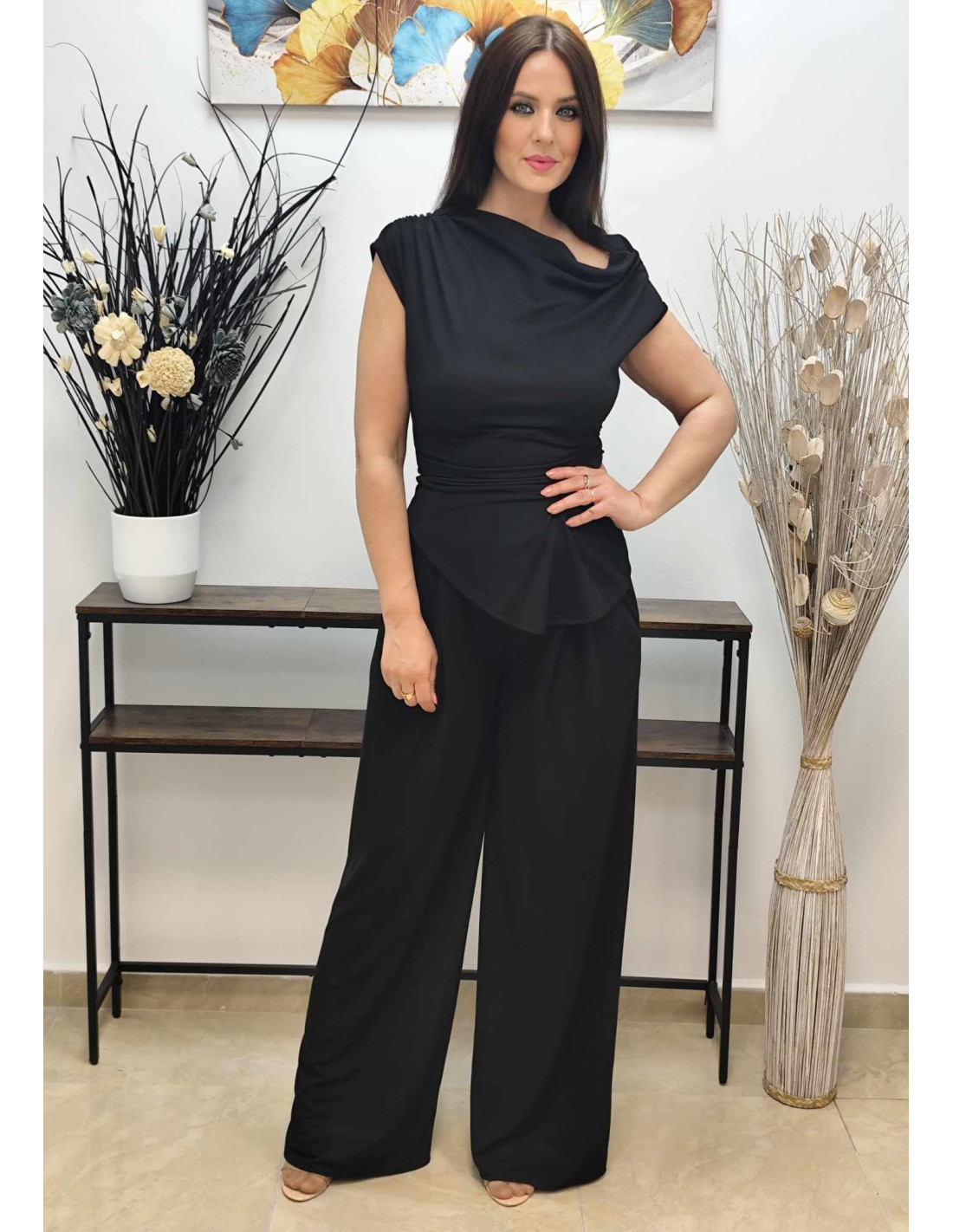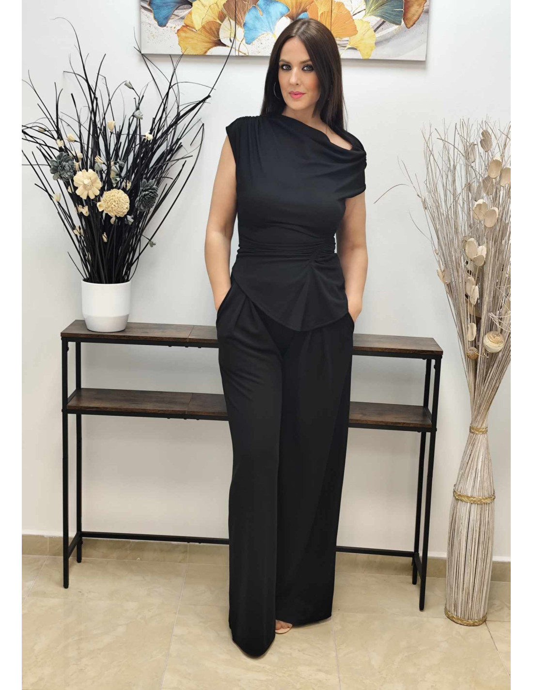 El top asimétrico es la pieza clave que aporta el toque distintivo al conjunto. Con fruncidos estratégicos en los hombros y en un lateral, crea un efecto visual dinámico y muy actual. Su diseño único te permitirá destacar con un estilo desenfadado pero chic.