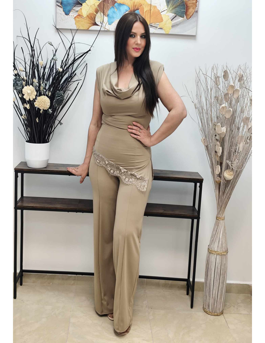 El top a juego es una verdadera declaración de estilo. Su bajo asimétrico le confiere un toque moderno y dinámico, complementado por un delicado detalle de encaje que aporta un punto de feminidad. El cuello drapeado añade sofisticación, y las hombreras estructuran la parte superior, creando una silueta poderosa y chic.