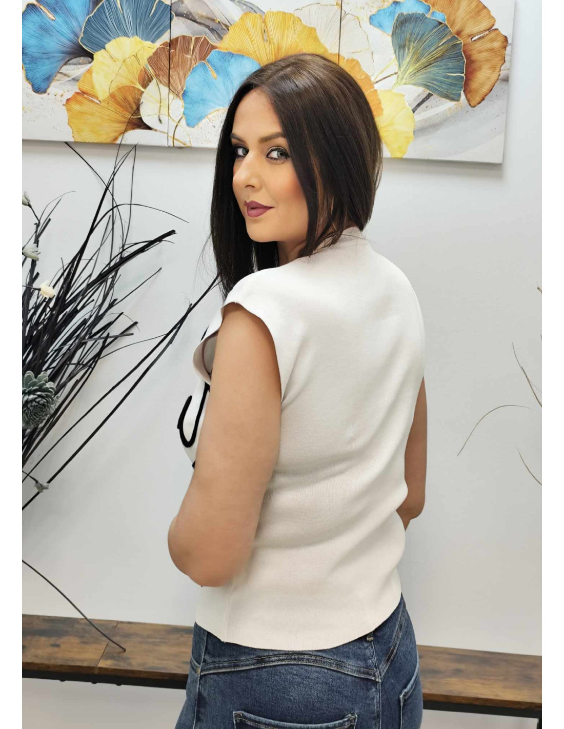 Este top es una verdadera joya para tu armario. Confeccionado en un suave punto, ofrece una sensación agradable al tacto y una caída que se adapta con elegancia. Su diseño clásico de cuello redondo y manga sisa lo convierte en una base versátil para cualquier conjunto, perfecto para los días más cálidos o para llevar bajo una chaqueta.