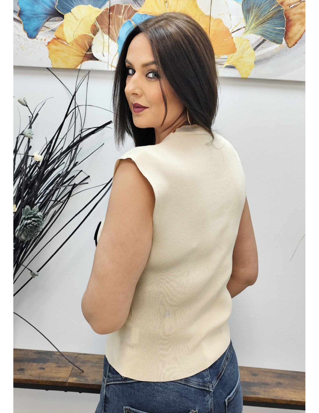 Este top es una verdadera joya para tu armario. Confeccionado en un suave punto, ofrece una sensación agradable al tacto y una caída que se adapta con elegancia. Su diseño clásico de cuello redondo y manga sisa lo convierte en una base versátil para cualquier conjunto, perfecto para los días más cálidos o para llevar bajo una chaqueta.