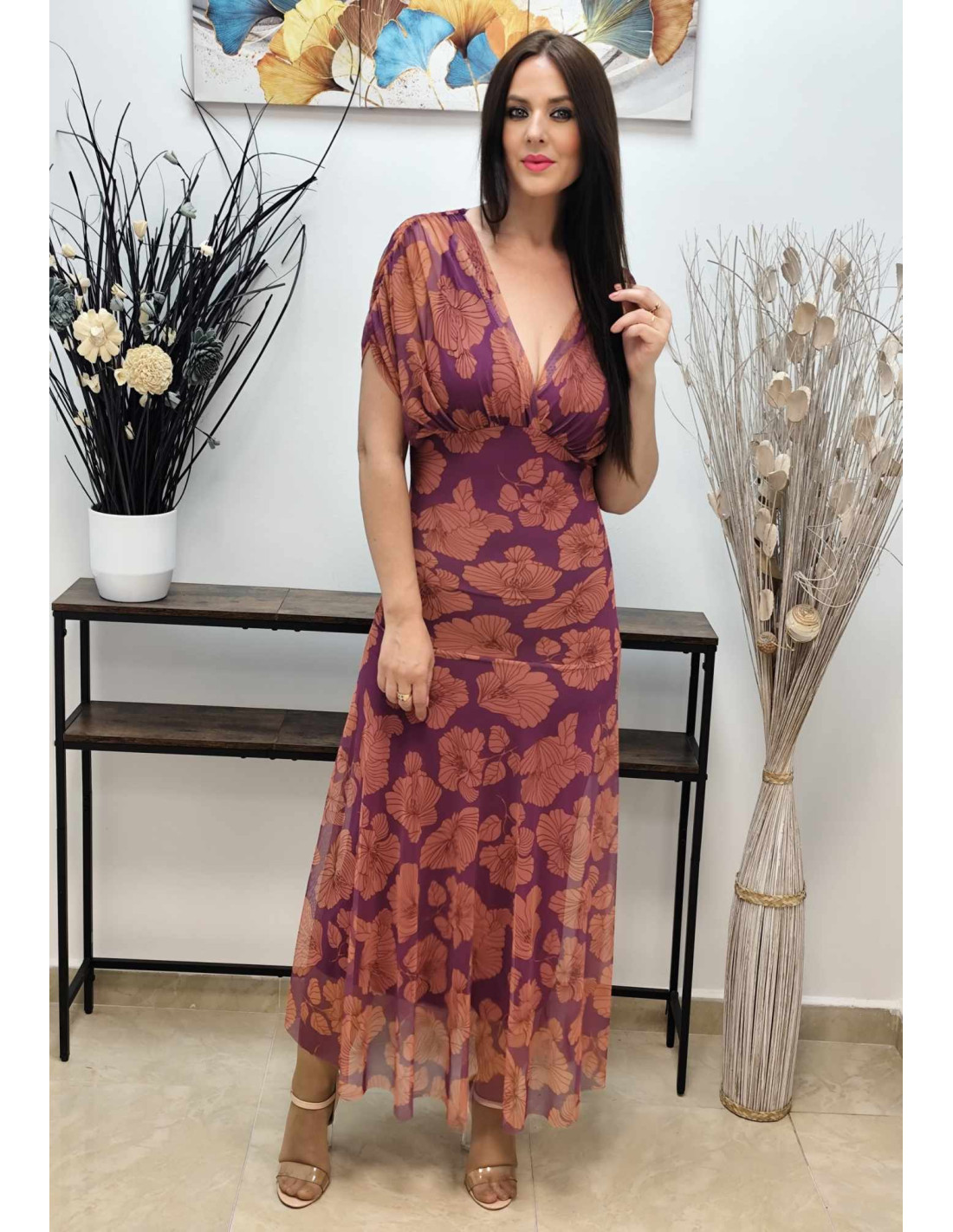 Confeccionado en un delicado tejido de tul con forro interior, su falda con vuelo crea una silueta etérea y con movimiento que te acompañará con gracia en cada paso. El favorecedor escote en V realza la figura, mientras que las mangas fruncidas añaden un detalle sutil y chic.