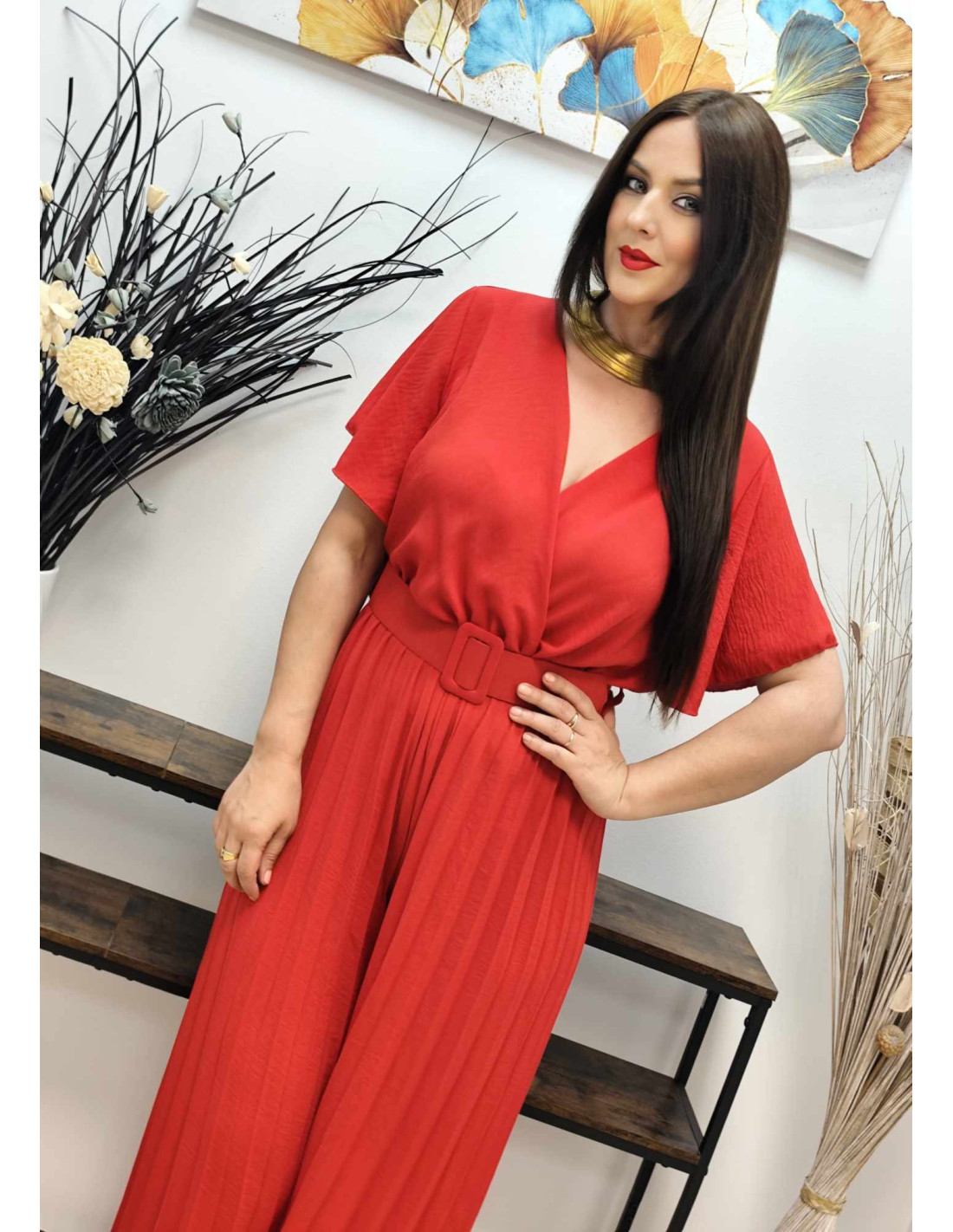 Descubre nuestro espectacular mono con pantalón palazzo plisado de gran caída, un cuerpo con escote cruzado y manga corta tipo capa. La goma en la cintura y el cinturón rígido a tono definen la silueta. Es talla única, súper amplio y se adapta de la 38 a la 50. Felisa, con sus 167 cm de alto, 100 cm de pecho, 80 cm de cintura y 103 cm de caderas, lo luciría perfectamente.